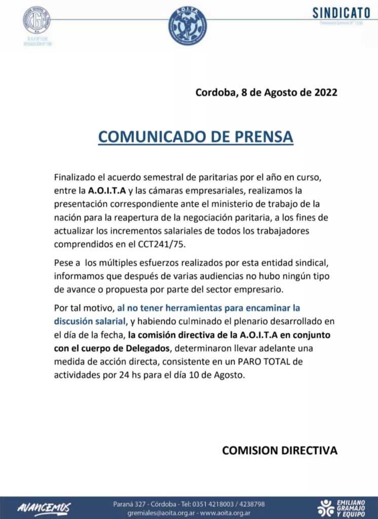 La Asociación Obrera de la Industria del Transporte Automotor (AOITA) realizará un paro de colectivos interurbanos en la provincia de Córdoba por 24 horas desde el primer minuto de este miércoles 10 de agosto.