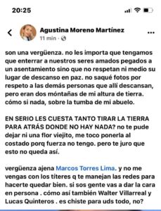 En su posteo la joven apuntó directamente al Intendente Marcos Torres, a Walter Villarreal y a Lucas Quinteros, quienes están a cargo del cementerio y pidió respuestas tras lo ocurrido.