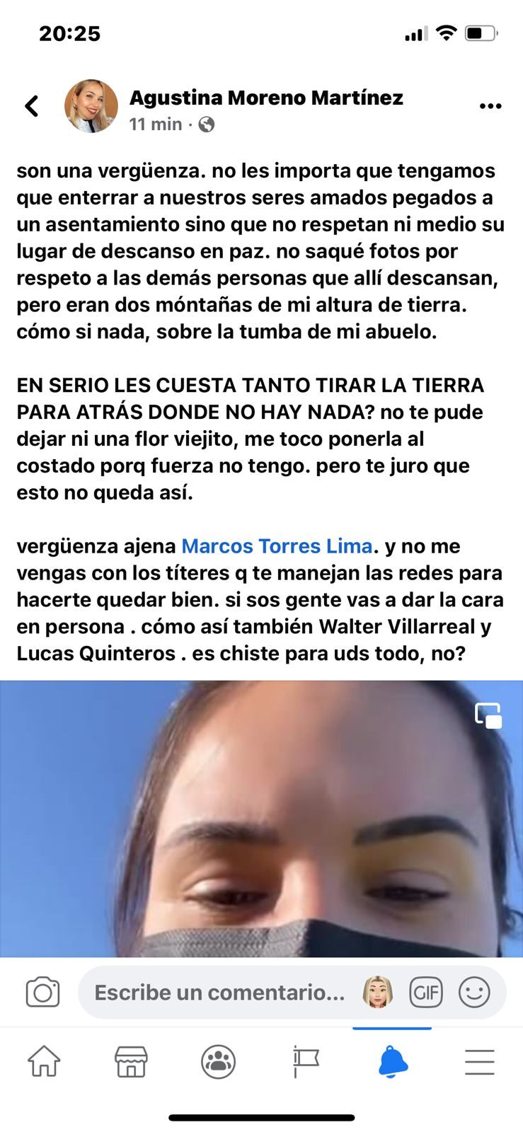 En su posteo la joven apuntó directamente al Intendente Marcos Torres, a Walter Villarreal y a Lucas Quinteros, quienes están a cargo del cementerio y pidió respuestas tras lo ocurrido.