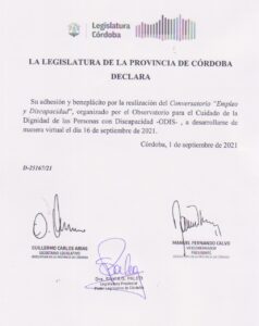 El conversatorio «Empleo y discapacidad» que llevará a cabo el Observatorio para la Discapacidad (ODis), organización de Alta Gracia, recibió en la tarde del pasado martes 14 el beneplácito y la adhesión de la legislatura provincial. El observatorio recibió la notificación durante la tarde de ayer, de manos de la legisladora Silvia Paleo, perteneciente al bloque de Juntos por el Cambio. La nota se encuentra firmada por ella, el vicegobernador y presidente del recinto Manuel Calvo y el secretario legislativo Guillermo Arias.