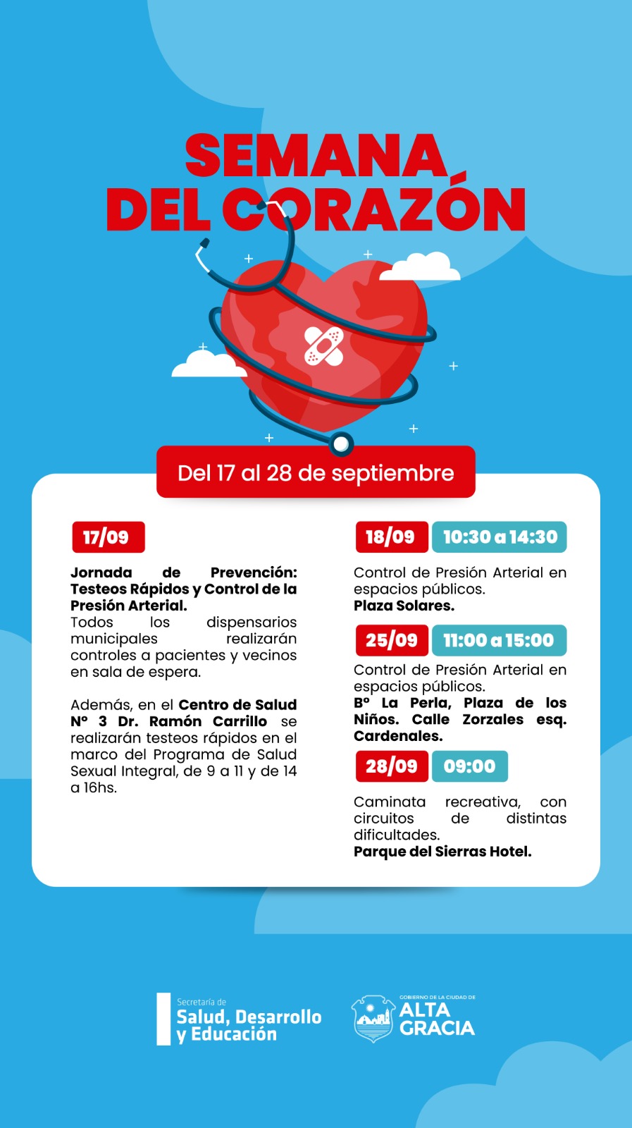 Desde el 14 y hasta el 28 de septiembre, La Secretaría de Salud, Desarrollo y Educación del Gobierno de Alta Gracia lleva adelante una serie de actividades de promoción y prevención que se enmarcan en la “Semana del Corazón”, rumbo al Día Mundial del Corazón que tendrá lugar el próximo 29 de septiembre.