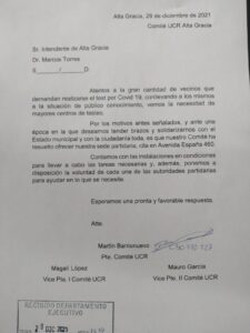 Luego de que el gobierno de Marcos Torres anunciara las nuevas medidas respecto a los testeos, el circuito Alta Gracia de la Unión Cívica Radical presentó en el departamento Ejeutivo una nota firmada por su presidente Martín Barrionuevo y sus vicepresidentes I y II, Magalí López y Mauro García respectivamente, en la cual que expresan su disposición y solidaridad con el municipio para reforzar el trabajo en los hisopados.