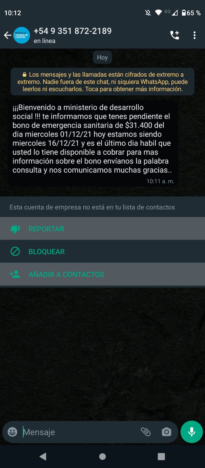 «Te informamos que tenes pendiente el bono de emergencia sanitaria de $31.400 del día miércoles 1/12/21. Hoy es miércoles 16/12/21 y es el último día hábil que usted lo tiene disponible a cobrar. Para más información sobre el bono envianos la palabra consulta y nos comunicamos. Muchas gracias».