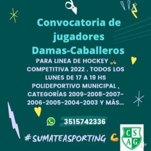 Pensando en 2022, el club Sporting de barrio Sur invita a jugadores y jugadoras de Alta Gracia y la zona a formar parte de los equipos de hockey de la institución, que actualmente se encuentran compitiendo en la Superliga. Las prácticas se desarrollan todos los lunes 17 a 19 horas en el estadio de hockey del Polideportivo Municipal.