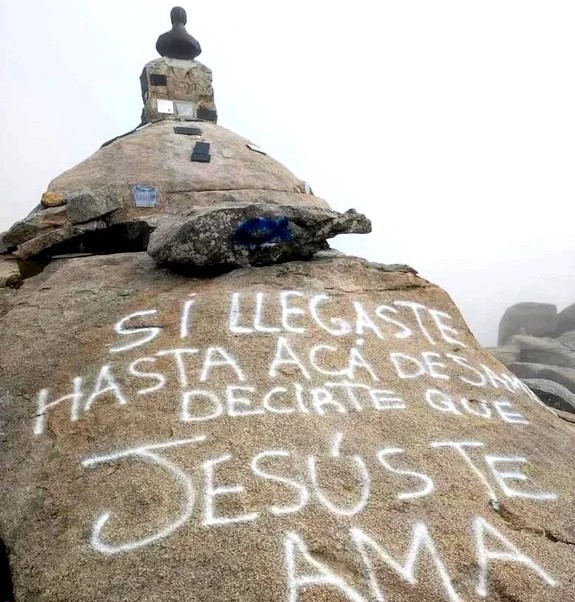 La cima del reconocido Cerro Champaquí, ubicado en las Sierras Grandes de Córdoba, apareció vandalizado con distintos símbolos y frases, de contenido religioso, que fueron realizadas sobre la piedra con pintura en aerosol aparentemente el pasado domingo.