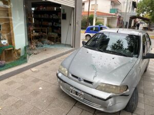 Una desgracia con suerte ocurrió durante este mediodía en la esquina de Cuyo y Avenida del Libertador. Alrededor de las 13, un Fiat Palio color gris que circulaba por Libertador perdió el control de su rodado, yendo a parar directamente contra la vidriera de un local comercial ubicado en esa intersección, rompiendo su vidriera y embistiendo una góndola que quedó totalmente destruida.