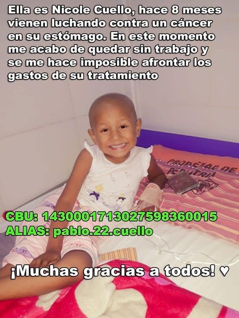 En las últimas horas se difundió por redes sociales un pedido de ayuda que impulsaba Pablo Cuello, un hombre que dice ser vecino de Alta Gracia y que asegura tener a su hija Nicolle atravesando una enfermedad. Cuello pide colaboración a los medios de comunicación para que difundan esta historia y así generar que las personas los ayuden con un depósito de dinero en una cuenta bancaria.