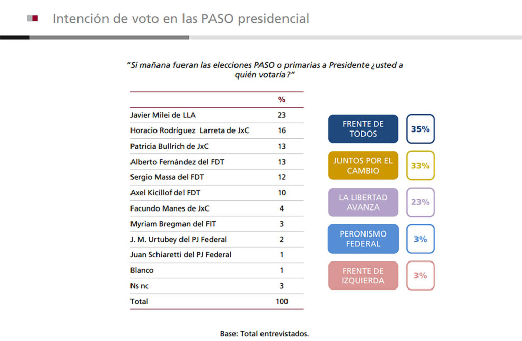 Respecto al electorado potencialmente en crecimiento de Javier Milei, según distintas consultoras como Poliarquía, CB y Giacobbe y As., provenientes de distintas vertientes políticas, sin menester que sean ideológicamente liberales. Desde Juntos por el Cambio relativizan los números del libertario, al menos públicamente. Mientras que el kirchnerismo duro es consciente de sus probabilidad de quedar terceros si Alberto Fernández – o alguien con peor imagen positiva – sea el candidato a presidente por el espacio.