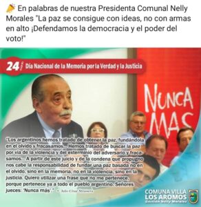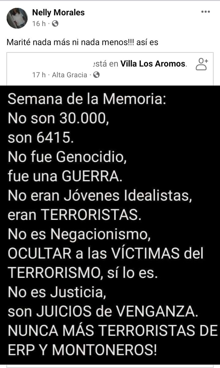 En el día Nacional de la Memoria por la Verdad y la Justicia, la jefa comunal de Villa Los Aromos, Nelly Morales, se despachó en sus perfiles de redes sociales con posteos negacionistas de la última dictadura militar. Las publicaciones generaron el repudio de algunos de sus seguidores y abrieron una polémica en los comentarios, algo muy habitual en esta clase de situaciones.
