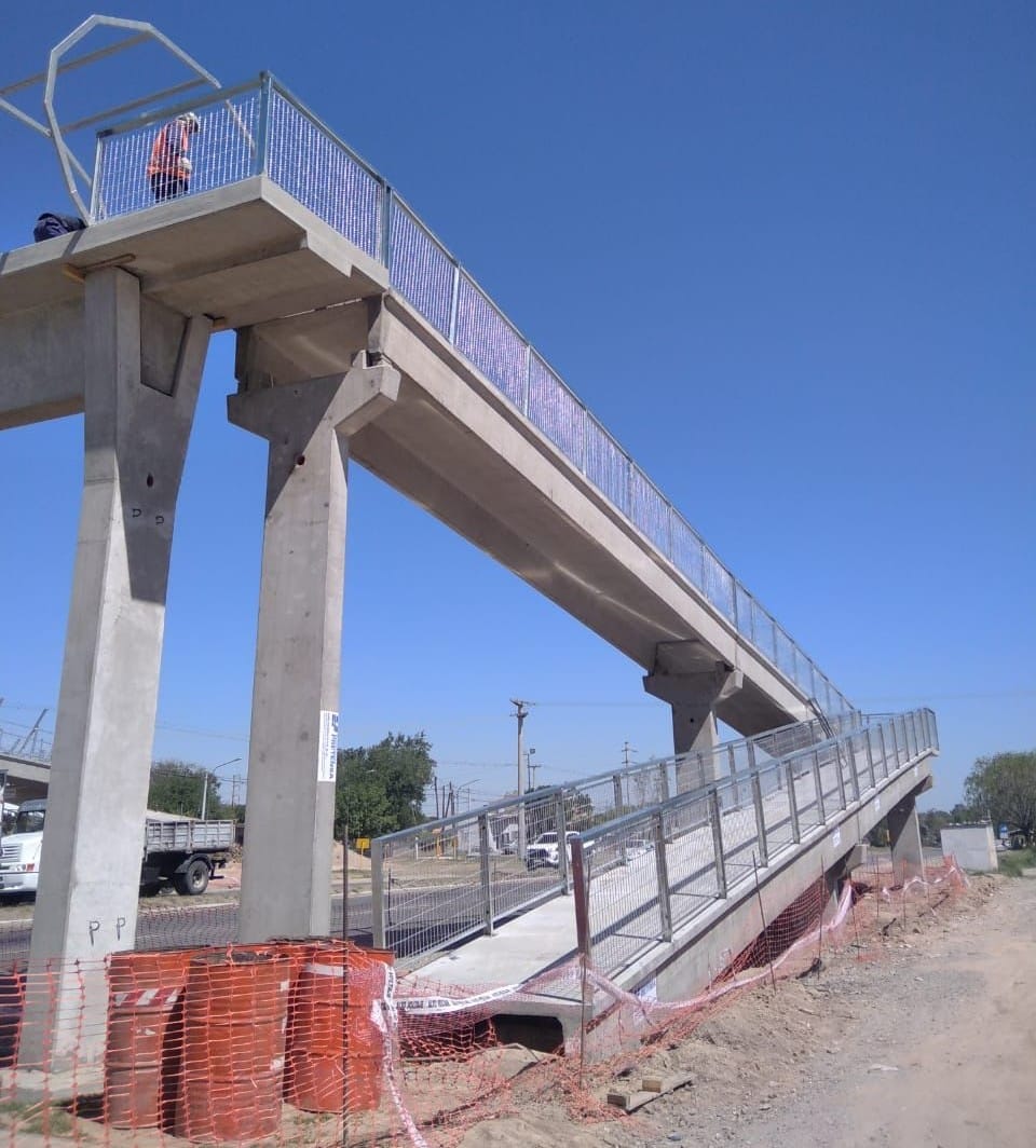 Los trabajos avanzan rápidamente en la pasarela que cruza sobre ruta 5, a la altura de barrio Parque San Juan y la avenida Malvinas Argentinas. Ya se terminaron las barandas de ambos tramos de las rampas y la viga que cruza sobre la ruta.