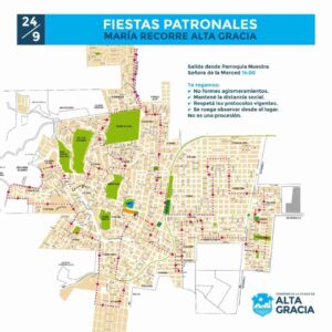 La Municipalidad de Alta Gracia dio a conocer el recorrido de la imagen de María en el marco de las fiestas patronales de nuestra ciudad, que se celebrarán el próximo 24 de septiembre. La imagen iniciará su trayecto a las 14 horas desde la iglesia de La Merced, para bajar por la calle España y continuar su recorrido por cada punto de la ciudad.