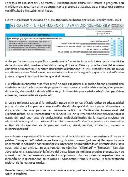 Ante la observación presentada por la organización de Alta Gracia, el INDEC informó que «se está planificando un nuevo estudio junto a la Agencia Nacional de Discapacidad (ANDIS)».