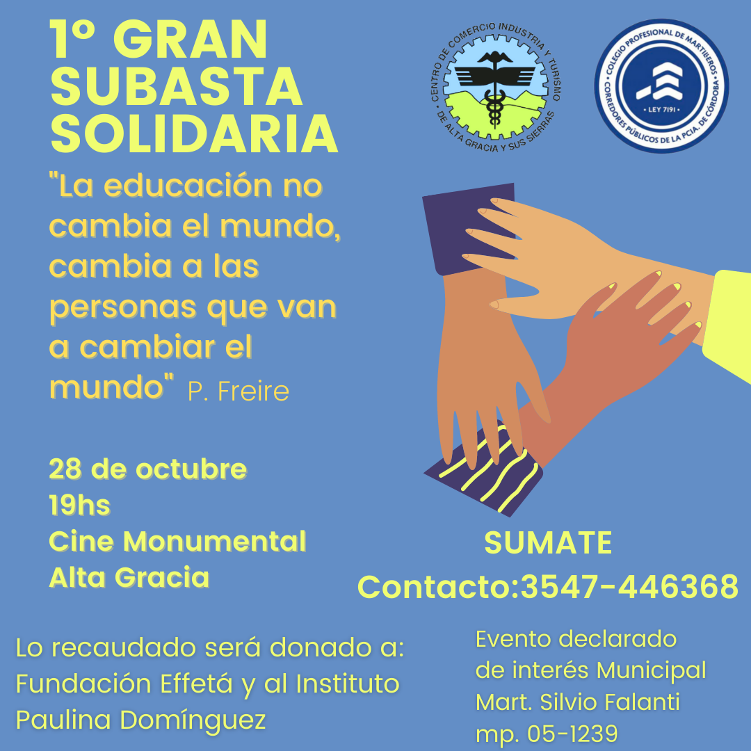 Este jueves 28 a partir de las 19 horas, se realizará en el Cine Monumental la primera subasta solidaria, llevada adelante por el Centro de Comercio y el Colegio Provincial de Martilleros. El evento, que fue declarado de interés municipal, recaudará fondos que serán donados a las entidades educativas Fundación Effetá e Instituto Paulina Domínguez.