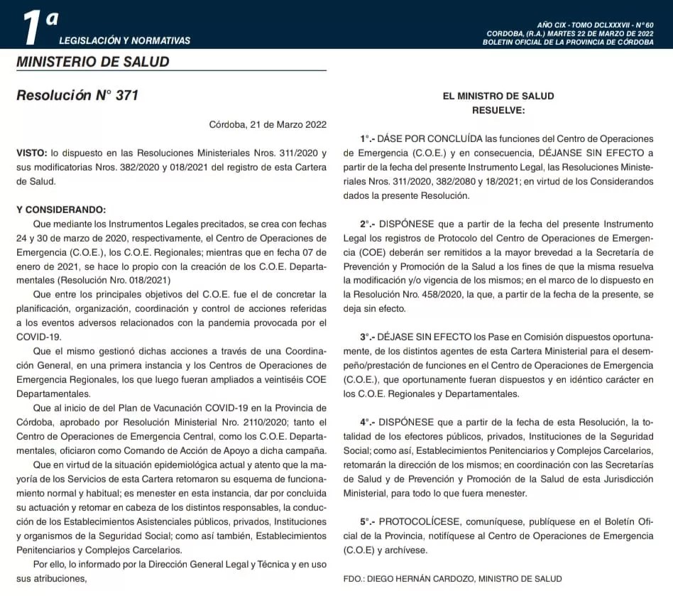 En los fundamentos de la resolución se argumenta que “en virtud de la situación epidemiológica actual y atento que la mayoría de los Servicios de esta Cartera retomaron su esquema de funcionamiento normal y habitual; es menester en esta instancia, dar por concluida su actuación y retomar en cabeza de los distintos responsables, la conducción de los Establecimientos Asistenciales públicos, privados, Instituciones y organismos de la Seguridad Social; como así también, Establecimientos Penitenciarios y Complejos Carcelarios”.