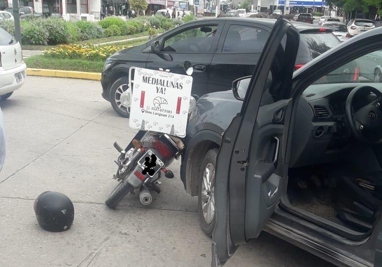 Un motociclista delivery que circulaba en una Honda Wave 110 cc. colisionó con un auto Volkswagen T-Cross en el que iba una pareja de adultos mayores.