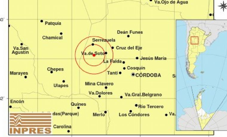 Según datos del INPRES (Instituto Nacional de Previsión Sísmica), el epicentro tuvo lugar a 122 km al noroeste de la capital cordobesa, 220 km al sureste de La Rioja y a 31 km al sur de Serrezuela.