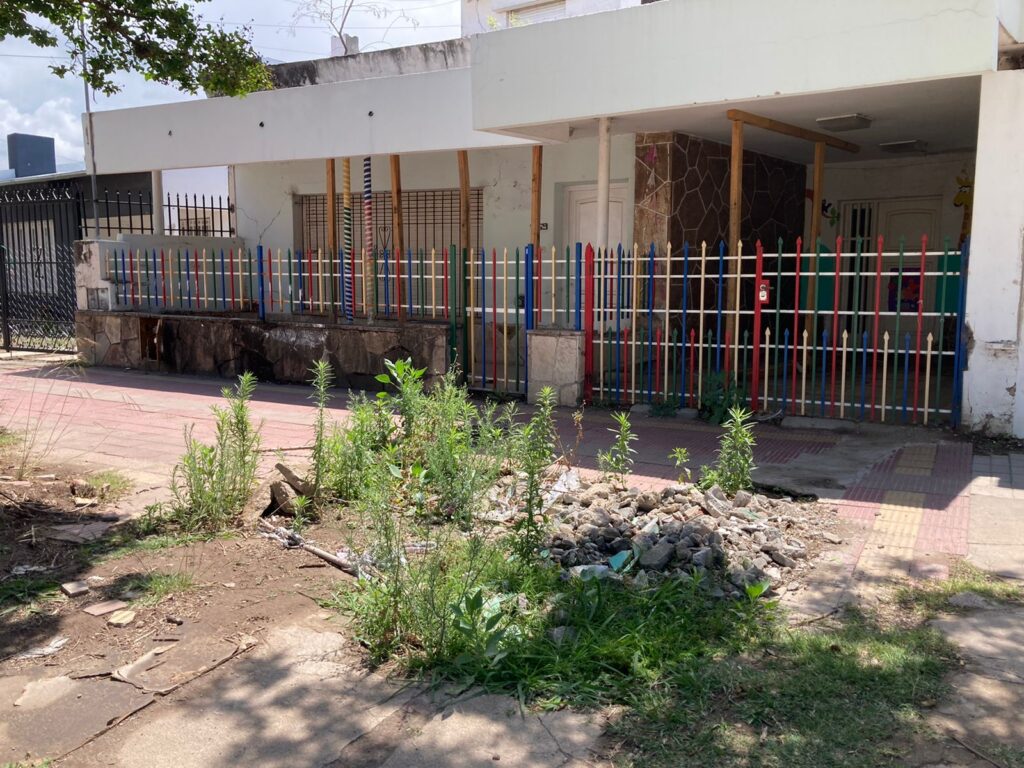 En la casa funcionaba anteriormente una guardería. Hoy allí no vive nadie pero está apuntalada con vigas en la parte del garage porque hay riesgo de que se desmorone, lo cual también es peligroso. Esto también provocó roturas en un local comercial colindante. Pero lo más preocupante es la vereda: se está hundiendo desde hace tiempo y las malezas no dejan de crecer.