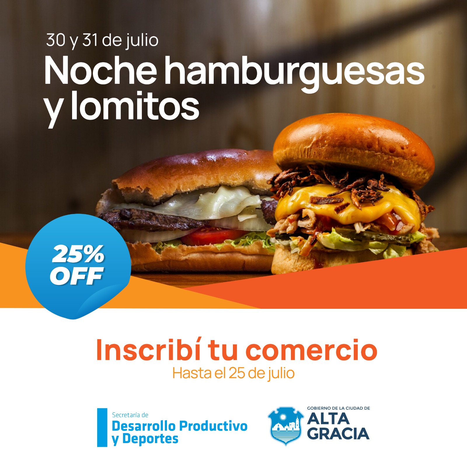 La Secretaría de Desarrollo Productivo y Deportes del Gobierno de Alta Gracia invita a comercios gastronómicos de la ciudad a participar de la “Noche de Hamburguesas y Lomitos”, que se llevará a cabo los días 30 y 31 de julio. Aquellos comercios que deseen participar, podrán inscribirse a través del formulario disponible en el siguiente enlace: https://forms.gle/LFN3W8MTumWxfcqR9